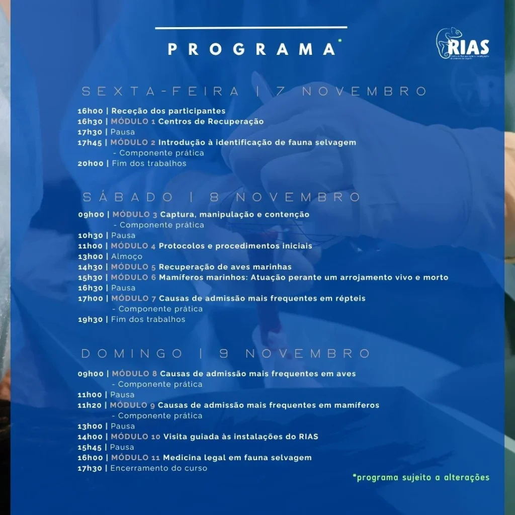 Nos três dias de curso serão abordados vários temas, com componentes práticas e teóricas, desde a introdução à identificação de fauna a procedimentos e protocolos clínicos, direcionados ao trabalho em Centro de Recuperação.