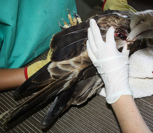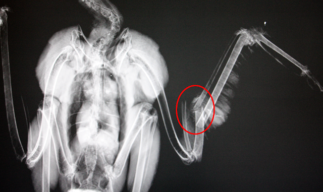 Após realizado o Raio-X, foi visível a gravidade da fratura. Desta forma, a melhor opção, que permitisse à ave voltar a voar, seria a intervenção cirúrgica.