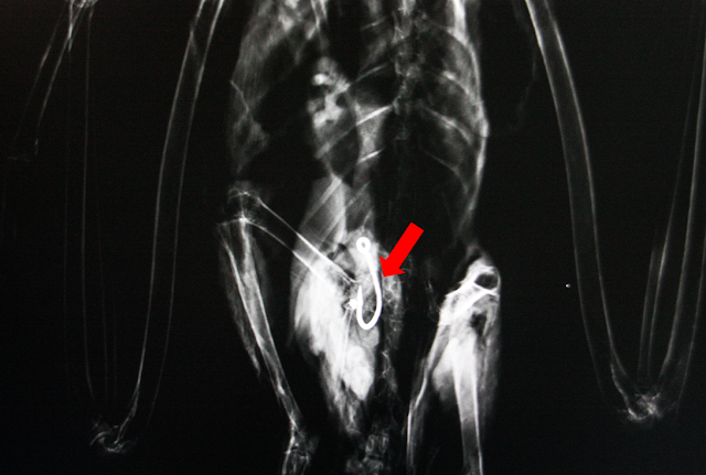 Esta ave ingressou com um fio preso no bico. Sem conseguir visualizar a origem, foi realizado um Raio-X que nos mostrou a existência, e por sua vez, localização, de um anzol no estômago do animal.