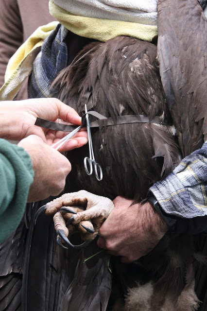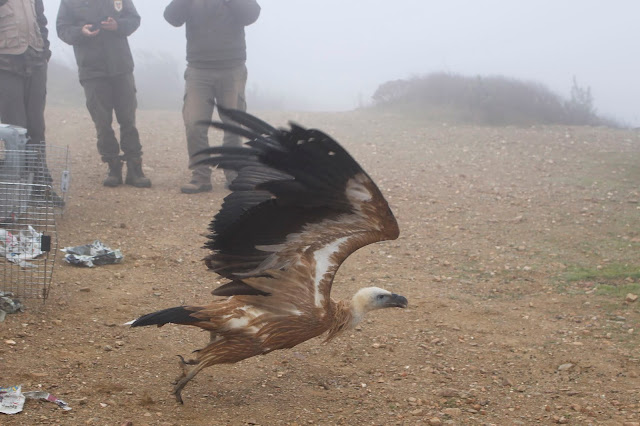 O abutre-preto, rapidamente batizado de Bruma, foi equipado com um emissor GPS-GSM fornecido pela Vulture Conservation Foundation (VCF), e libertado a partir de uma colina sobre o rio Guadiana, em Mértola.