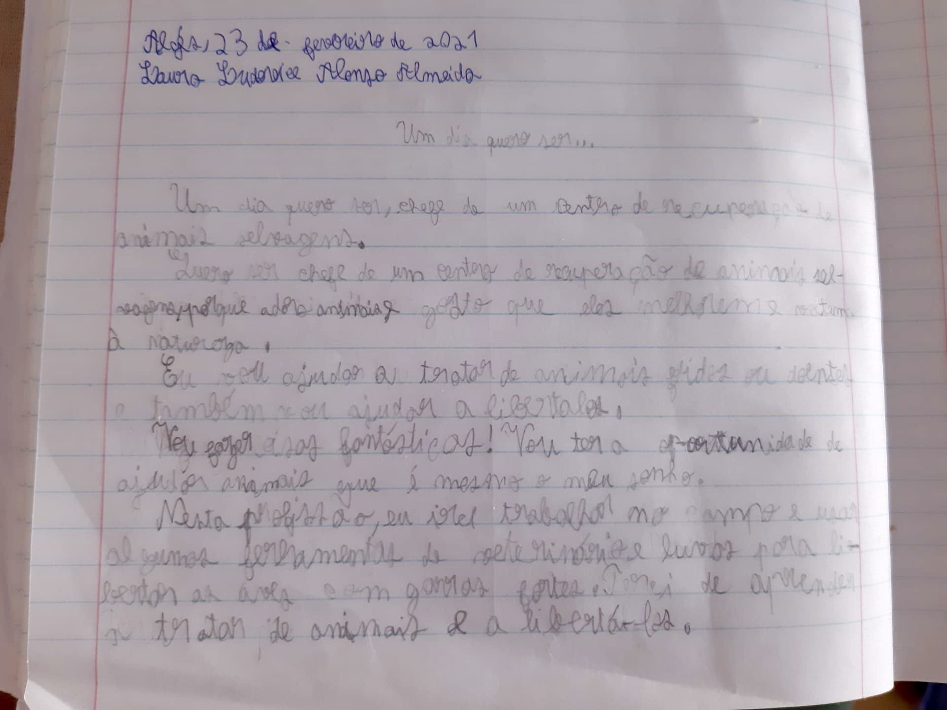 Quero ser chefe de um centro de recuperação de animais selvagens porque adoro animais e gosto que eles melhorem e voltem à natureza.