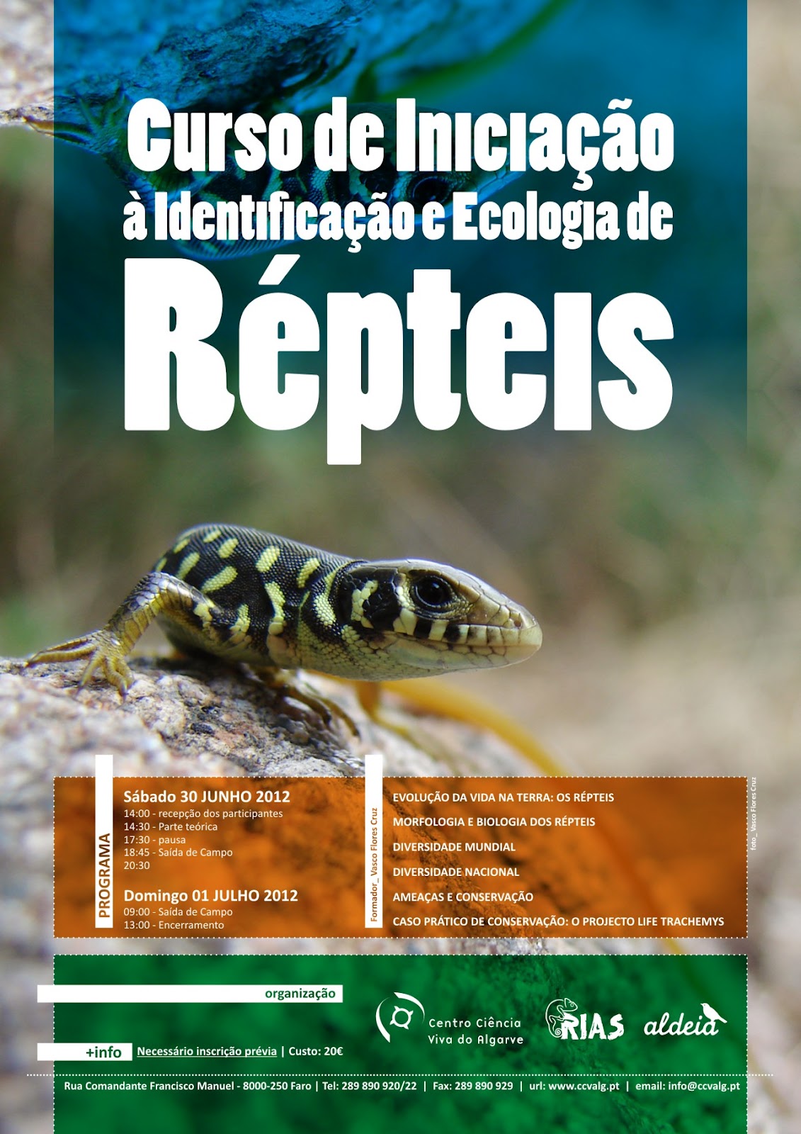 Em parceria com o Centro de Ciência Viva do Algarve, o RIAS/ALDEIA organiza o Curso de Iniciação à Identificação e Ecologia de Répteis que decorrerá nos dias 30 de Junho e 1 de Julho de 2012, em Faro.