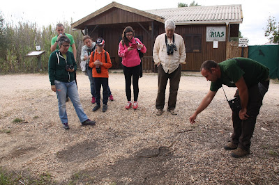 Esta cobra-de-ferradura foi encontrada nas instalações do RIAS. Estava a tentar alimentar-se na divisão que temos para a criação de ratos. Foi apanhada e imediatamente libertada com participantes do curso de iniciação à observação de aves.