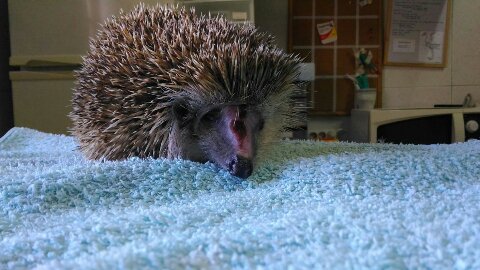 Quando chegou ao centro estava muito apático, não se enrolava e estava completamente coberto de sujidade. Para além disso apresentava uma ferida na face, que por se encontrar demasiado perto dos olhos, boca e nariz, era de difícil tratamento. Por esse motivo a nossa equipa veterinária decidiu tratar o ferimento com aloé vera, resultando numa recuperação extraordinária.