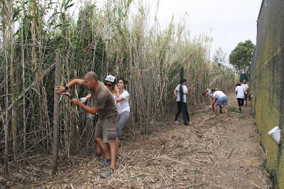 Durante o dia, removeram canas e vegetação, colocaram vedação exterior e substituíram rede de sombra nas jaulas exteriores.