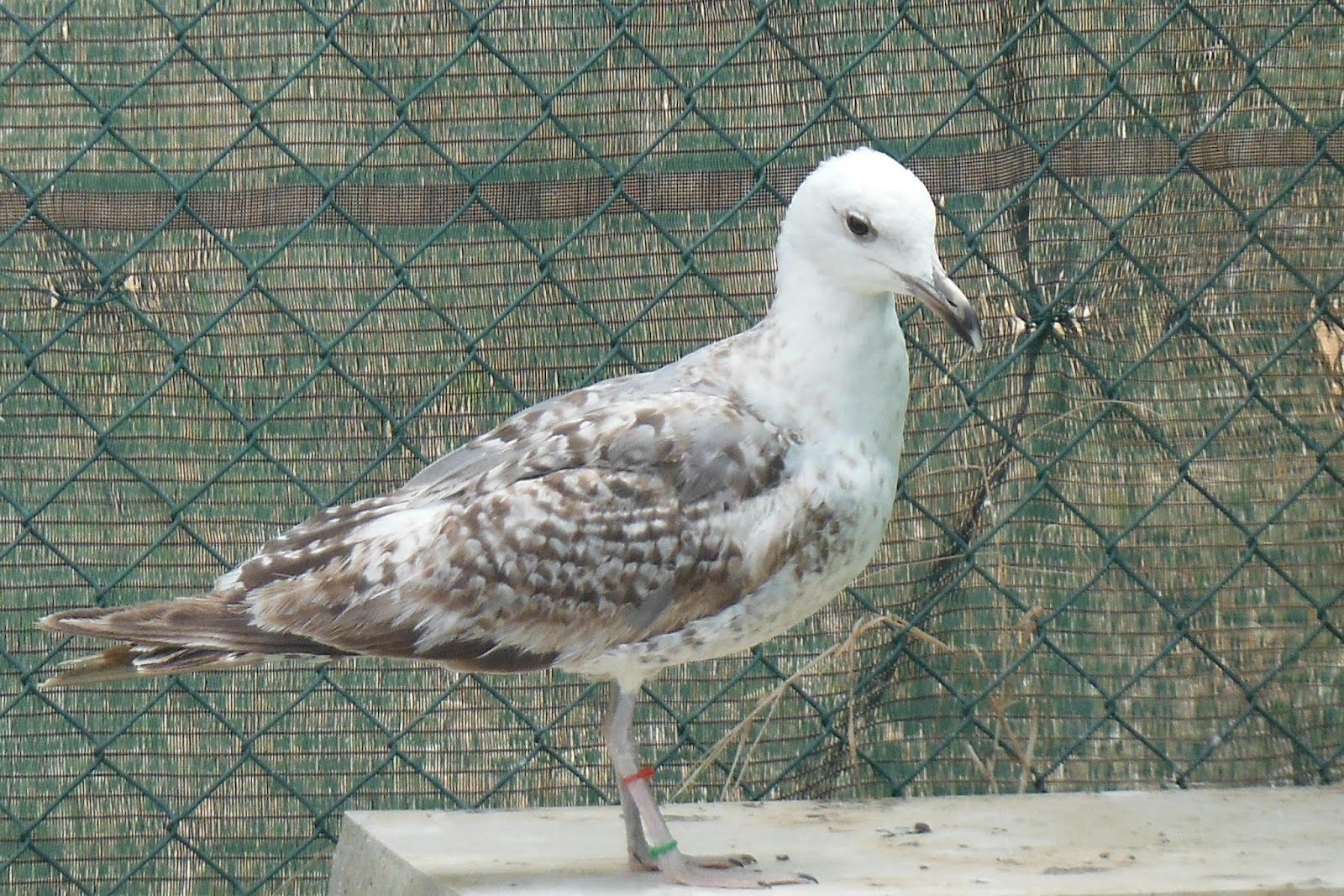 Gaivota-de-patas-amarelas de 3º ano em recuperação no RIAS – Centro de Recuperação e Investigação de Animais Selvagens. As abraçadeiras coloridas nas patas representam um código de identificação que permite distinguir com maior brevidade os vários indivíduos internados.