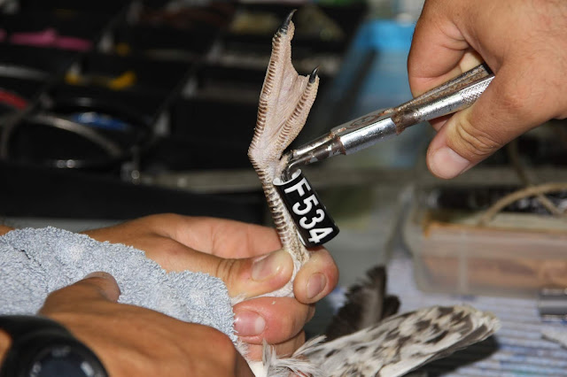 Colocação de anilha plástica colorida com código alfanumérico numa gaivota-d’asa-escura imatura de 1º ano, momentos antes da sua devolução à natureza.