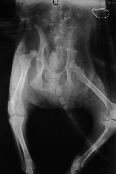 Durante o exame clínico foi-lhe diagnosticada uma luxação coxo-femoral traumática (desarticulação da cabeça do fémur com a bacia). O animal também estava desidratado e subnutrido.