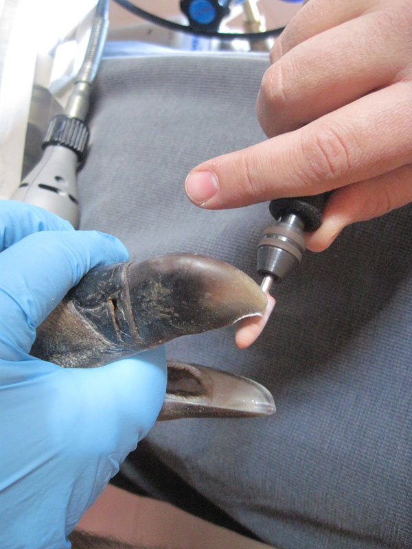 Cerca de um mês depois de ter dado entrada no centro, procedeu-se ao afiamento do bico (ver imagem) e verificou-se que o animal conseguia alimentar-se naturalmente.