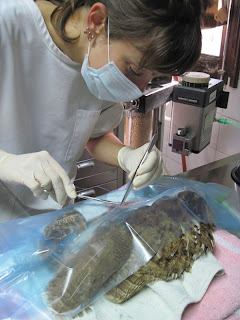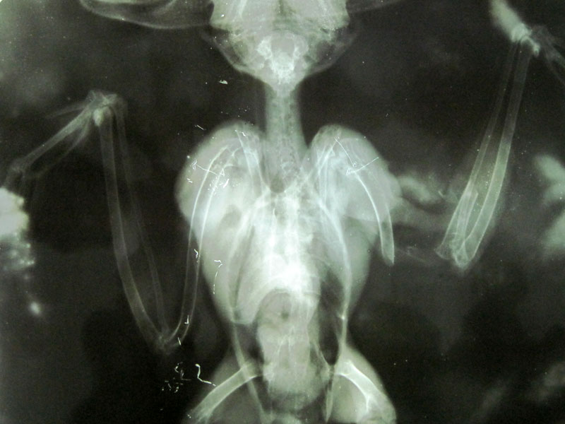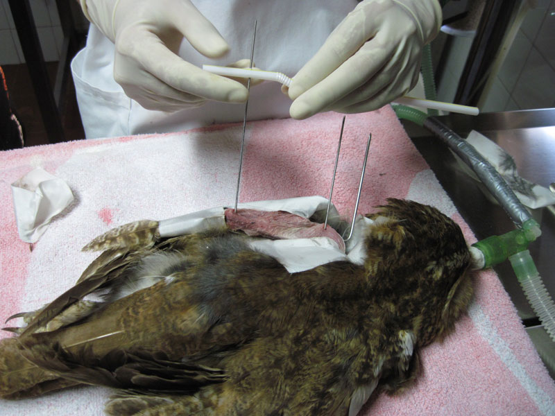 O animal apresentava uma fractura de úmero esquerdo, que só foi possível resolver cirurgicamente. O processo de recuperação foi longo e consistiu em alimentação cuidada, descanso e tratamento das feridas cirúrgicas. Mais tarde foram realizadas pequenas sessões de fisioterapia de modo a melhorar os movimentos da asa.