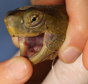 | Cágado-mediterrânico (Mauremys leprosa) com anzol no interior da boca. |