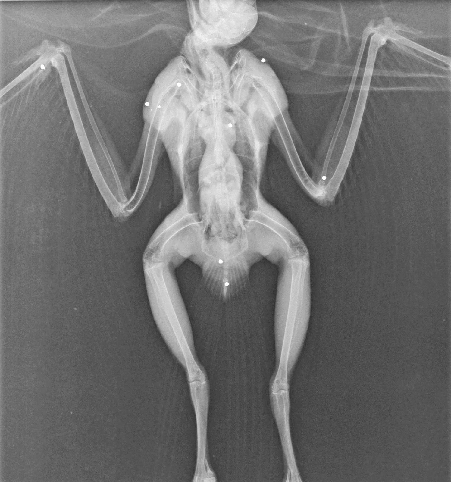 No exame físico verificou-se uma inflamação da zona do cotovelo esquerdo e diversas penas com perfurações em forma de cunha (Imagem 1) o que levantou suspeita de tiro. Assim, foi realizado um raio-x, na clínica INEMVET (parceiros do RIAS) onde se verificou a presença de 8 chumbos alojados no corpo do animal (Imagem 2).