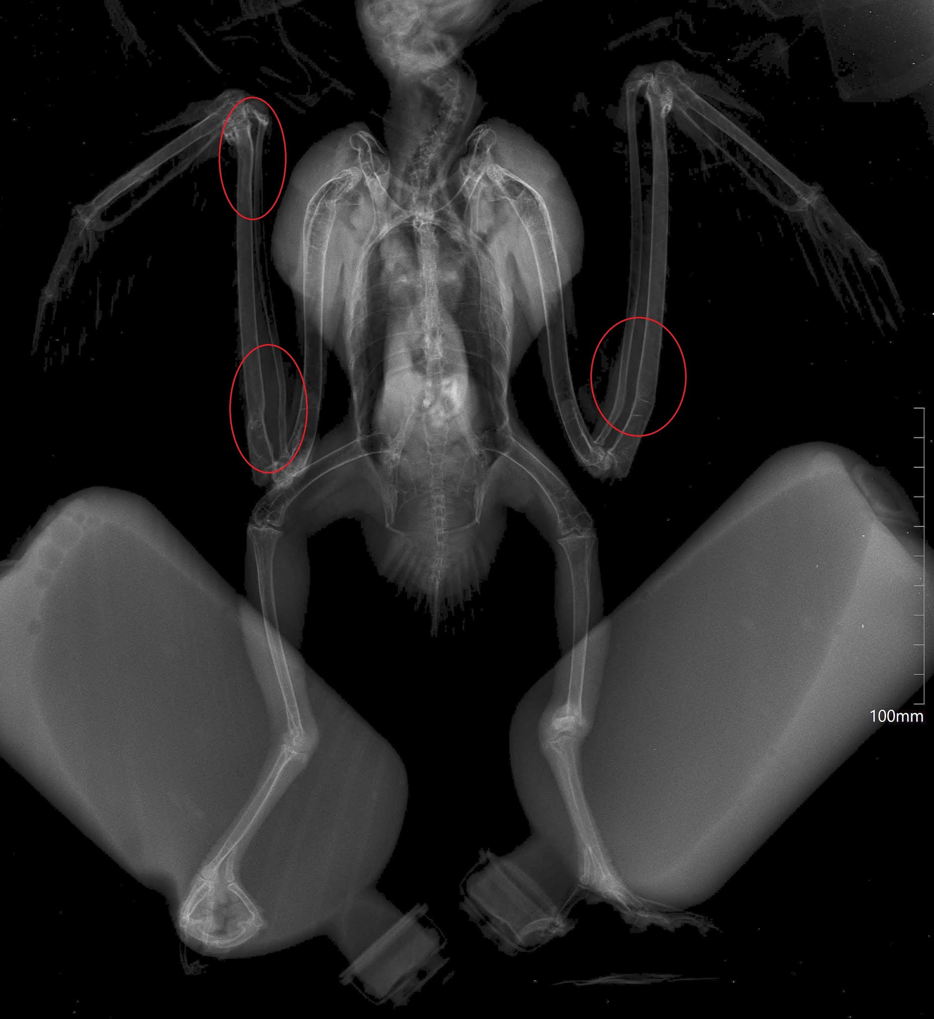 O Raio-x realizado mostrou graves deformidades nos ossos das asas e das patas, um sintoma compatível com osteodistrofia nutricional (patologia muito frequente em animais mantidos com alimentação inadequada durante o seu crescimento, e/ou por um longo período de tempo).