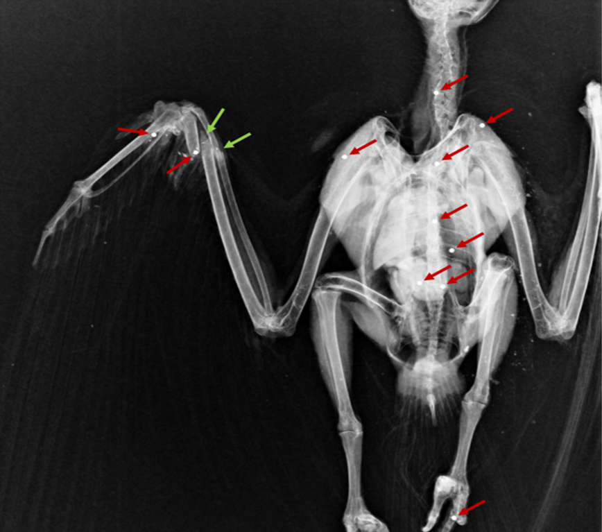 Como se pode ver no raio-x, o animal tinha 11 chumbos (setas vermelhas) alojados por todo o corpo, e 2 fracturas (setas verdes) na asa direita provocadas pelos mesmos. Na necropsia foi ainda possível observar lesões de um chumbo que atravessou o animal na cabeça, tendo entrado pelo palato e saído pelo crânio. Eram ainda evidentes lesões no coração e no fígado.