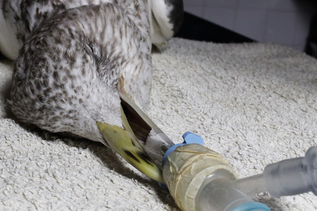 Na Quarta-feira foi realizada cirurgia a uma gaivota-d’asa-escura (Larus fuscus) que apresentava uma massa junto à mandíbula. Poucos minutos depois do procedimento, já conseguia alimentar-se sozinha, e está a recuperar bem.