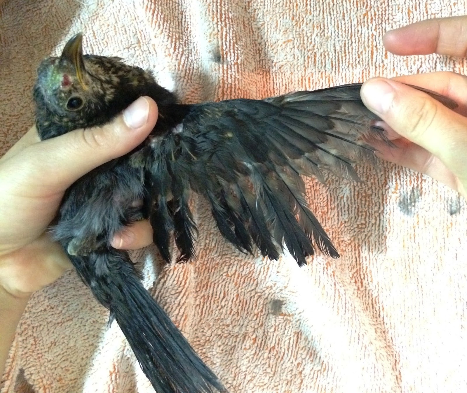 Melro com as penas partidas e feridas no bico devido à gaiola onde foi mantido