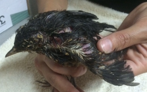 Melro com a plumagem completamente suja com papa
