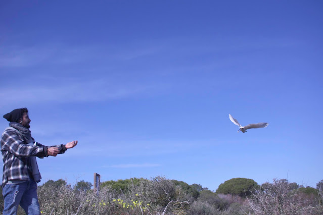 Em janeiro, membros da nossa equipa foram alertados para o facto de haver uma garça-boieira (Bubulcus ibis) emaranhada num fio no topo de uma árvore, aqui mesmo na Quinta de Marim, em Olhão. Na impossibilidade de deixar o animal em sofrimento, e dada a proximidade ao RIAS, o nosso reabilitador entrou no lago para resgatar a ave.