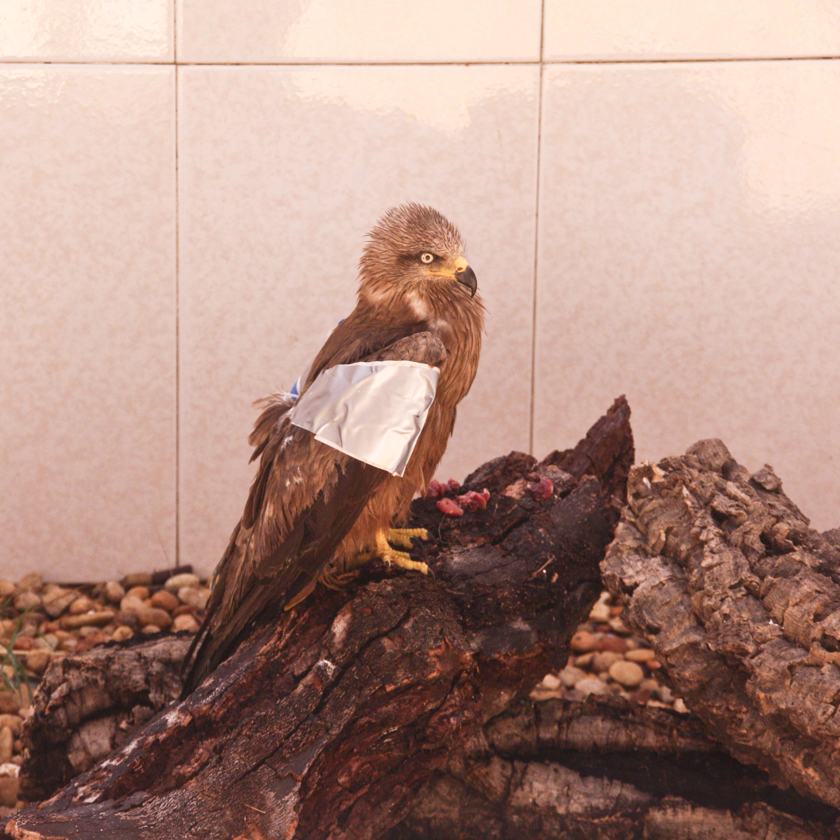 Foi então necessário fazer ligaduras nas asas, para evitar o movimento e consequente pioria da condição física, e administração de antibiótico. Apresentando também debilidade, por não se conseguir alimentar, recebeu fluídos sub-cutâneos para uma rápida hidratação, e foi-lhe fornecido alimento.