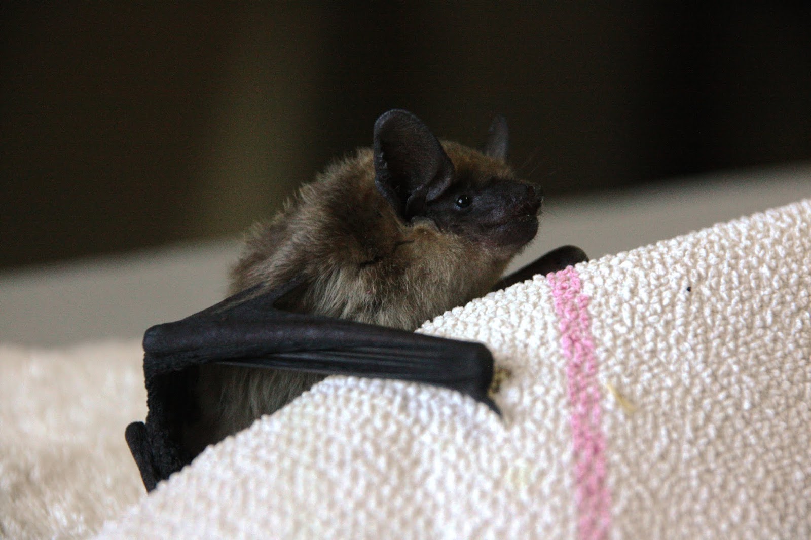 Morcego-hortelão-escuro que sobreviveu à predação por um cão doméstico e se encontra em reabilitação.