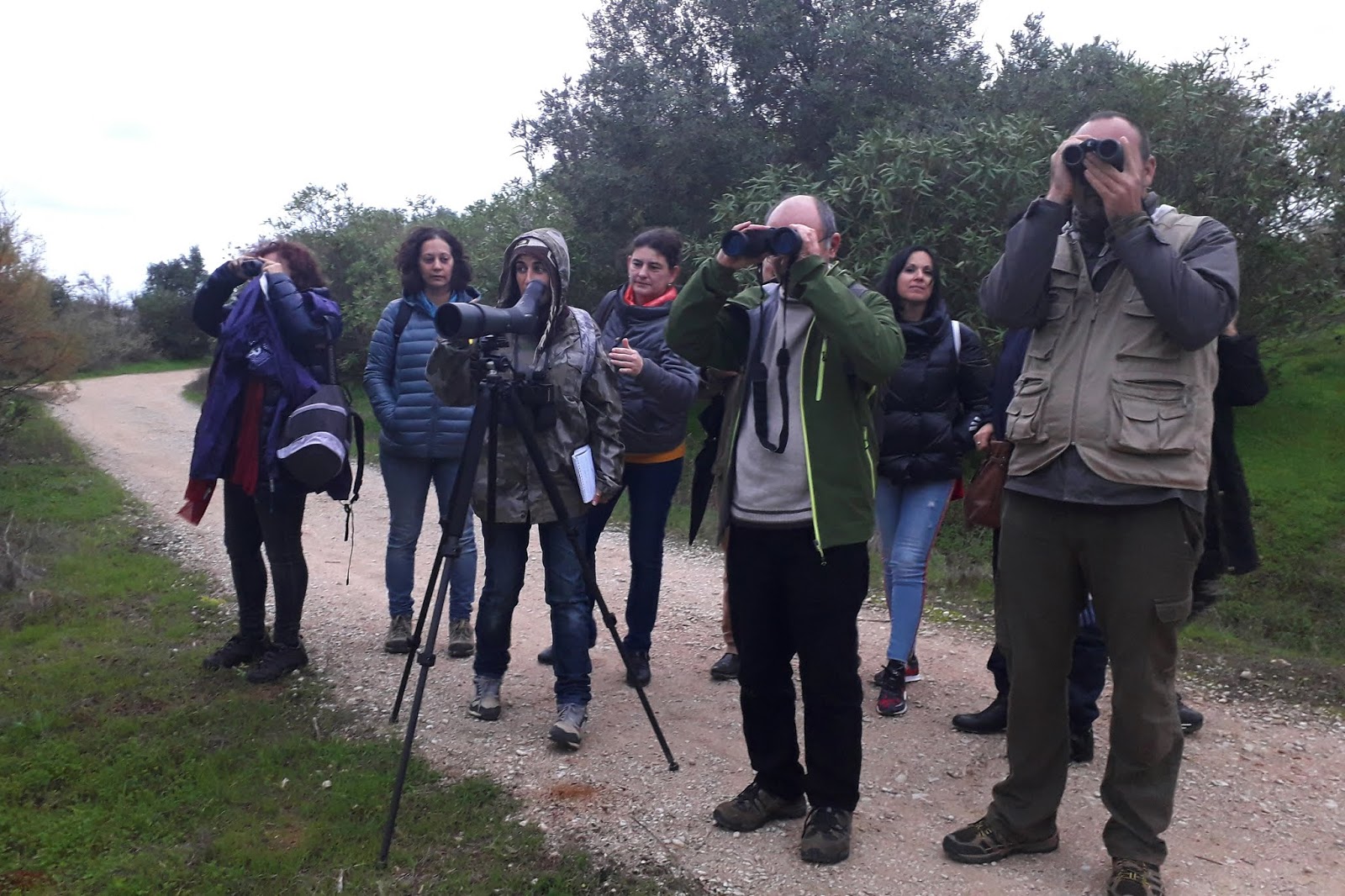 | Participantes na formação “A Ria Formosa como sala de aula teórico-prática” observando alcaravões (Burhinus oedicnemus) na Quinta de Marim. |